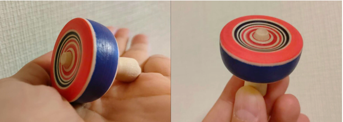 ■Features of the Ōyama Spinning Top The thick central shaft gives it stability, allowing it to spin for a long time. The basic colors are vermilion, purple, and indigo, which blend into beautiful patterns when the top is spinning. The material used is dogwood, giving the top a rounded, weighty form with a distinctive presence.
