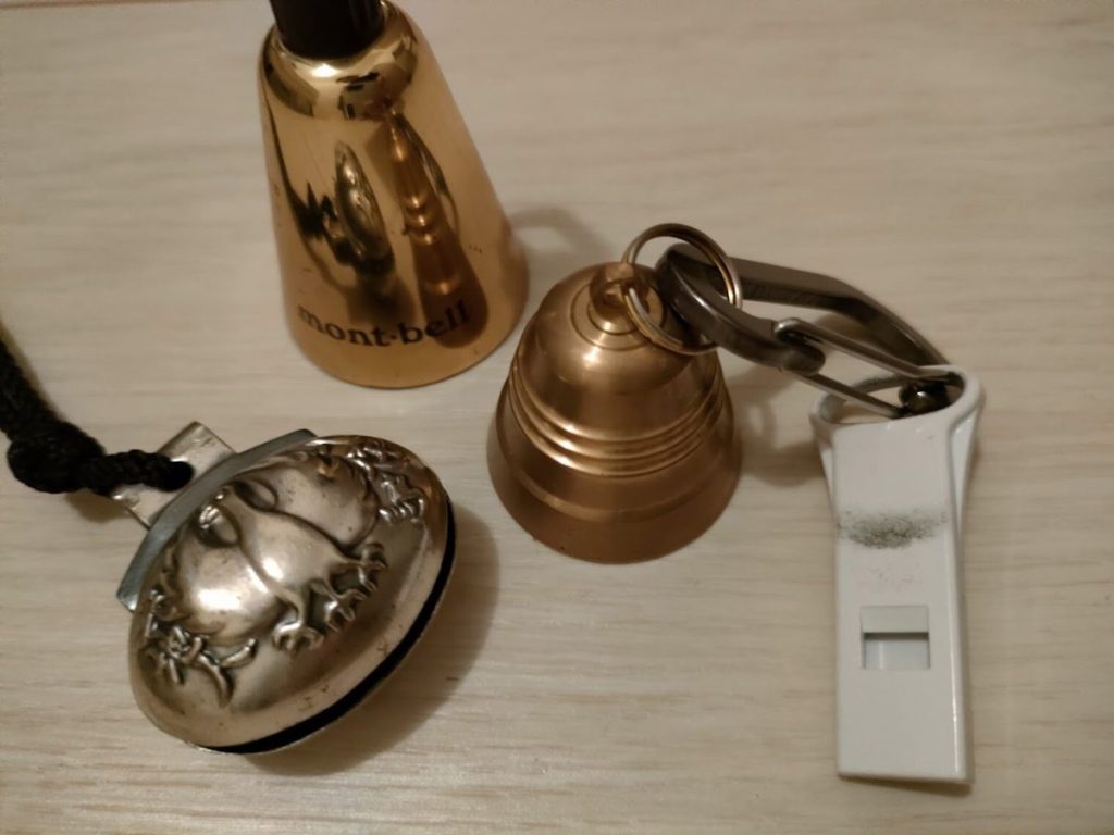 筆者の携帯している熊鈴はこちら。モンベルのベル小と大+熊野神社の鈴の計3つです。1つはショルダーベルトにつけるので、緊急時の笛も合わせて。ただあくまでも予防の1つで”鈴を持っているから絶対安全ではありません!” 情報収集と対策ともに万全にして夏山を楽しみましょう。